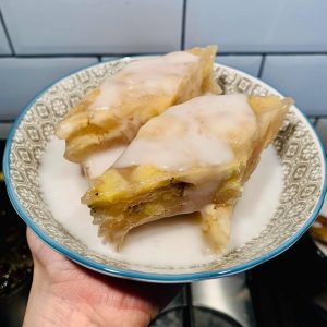 – Đường thốt nốt nấu với 250ml nước trắng,đun cho tan đường tắt bếp,để nước bớt nóng nhưng đừng để nguội quá khi đổ vào bột sẽ khó hoà bột.Bột tan hết thì đổ phần chuối đã cắt lát vào trộn đều.